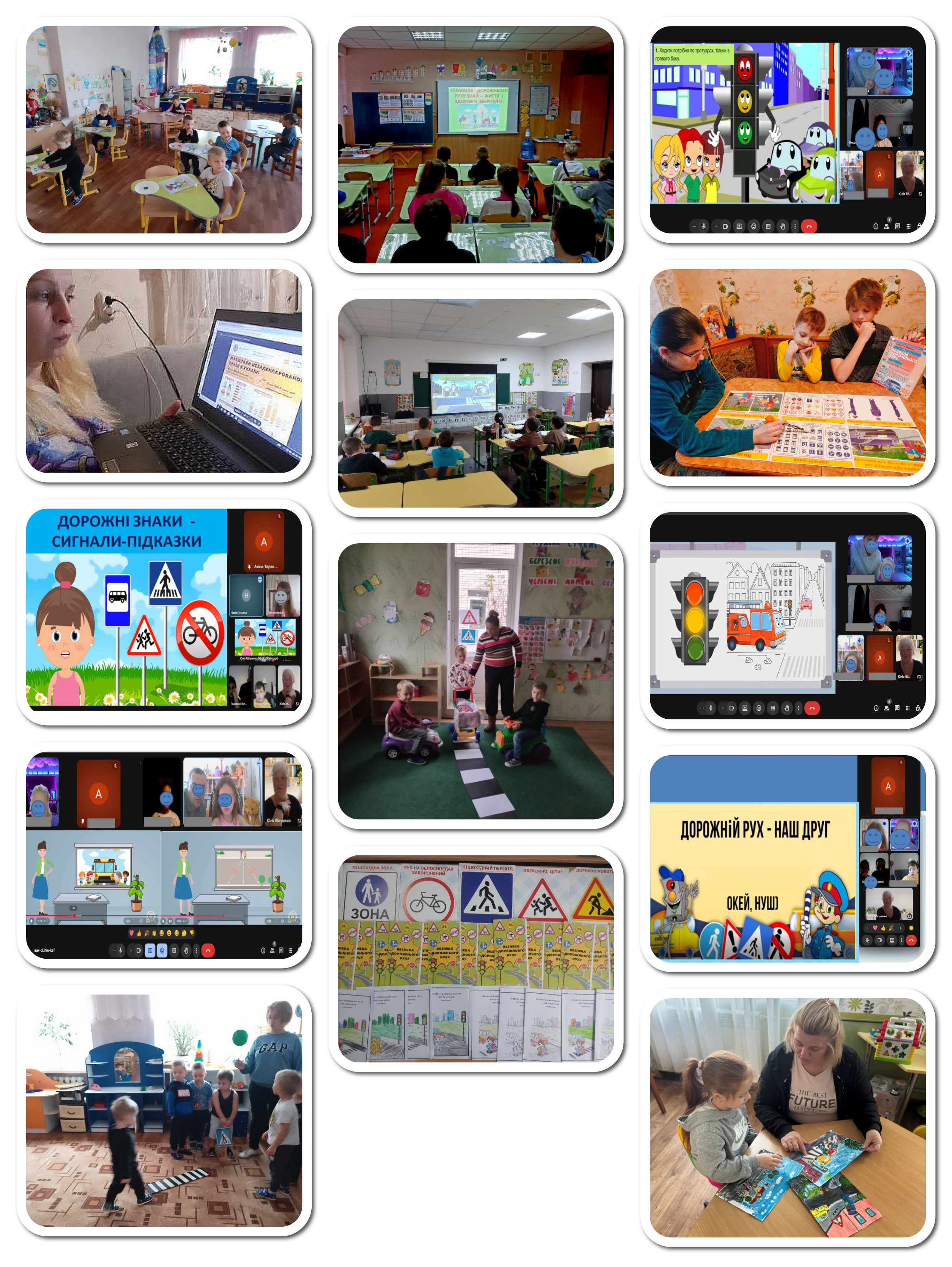- бесіди: «Дорожні знаки та їх значення», «Правила для пішоходів», «Безпека перебування на вулицях: правила дорожнього руху, дорожньо-транспортні пригоди, типові травмування пішоходів», «Відповідальність водія та пішохода перед законом», «Молодь за безпеку дорожнього руху», «Правила для велосипедистів, водіїв, пасажирів»;