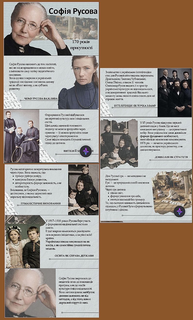 Софія Русова присвятила своє життя боротьбі за право дитини навчатися рідною мовою, виховуватися в атмосфері національної культури, духовності та поваги до особистості. Вона була переконана, що дошкільне виховання є фундаментом формування людини, а вихователь — це не просто носій знань, а передусім духовний наставник, який допомагає дитині пізнати себе і світ.