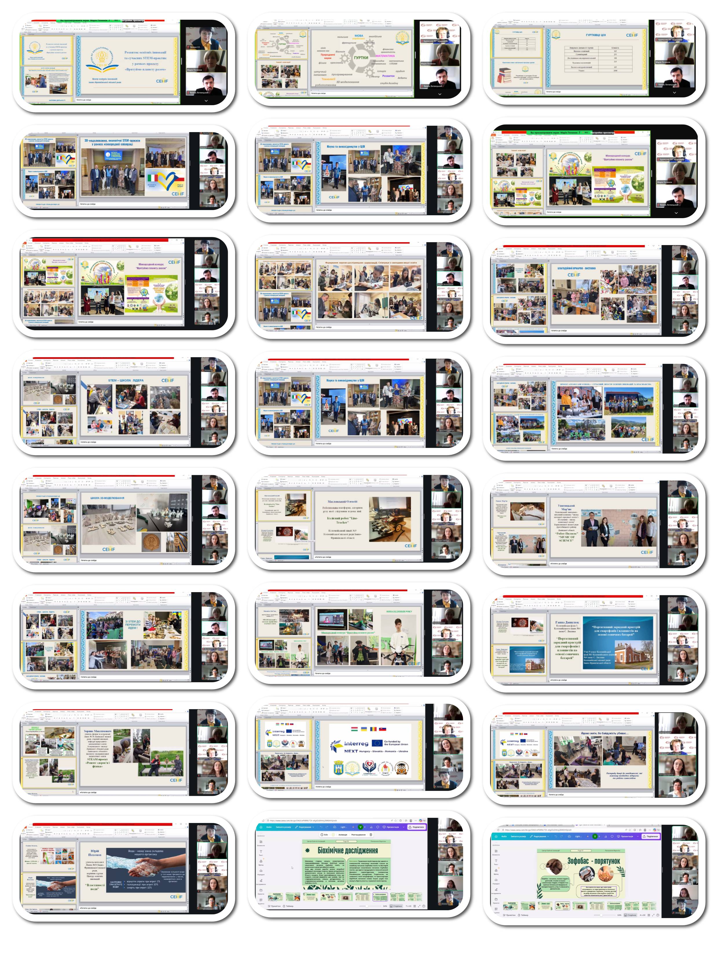 Учасники онлайн-зустрічі ознайомилися з сучасними STEM-практиками, 3-D моделюванням, екологічними STEM проєктами у рамках міжнародної співпраці, які продемонстрували викладачі та молодь-винахідники з різних закладів освіти. Здобувачі освіти та викладачка природничих дисциплін нашого коледжу отримати позитивний досвід з впровадження в освітній процес інноваційних технологій, проєктів, а саме: ознайомились з проєктами «Біореактор», «STEАM – СAMP – SCHOOL» - сучасний простір інновацій та краєзнавства, STEАM-проєктом «Рецепт здоров'я і фізика», роботизованими платформами, портативними зарядними пристроями для смартфонів і планшетів на основі сонячних батарей; було розглянуто властивості води та представлено біохімічні дослідження.