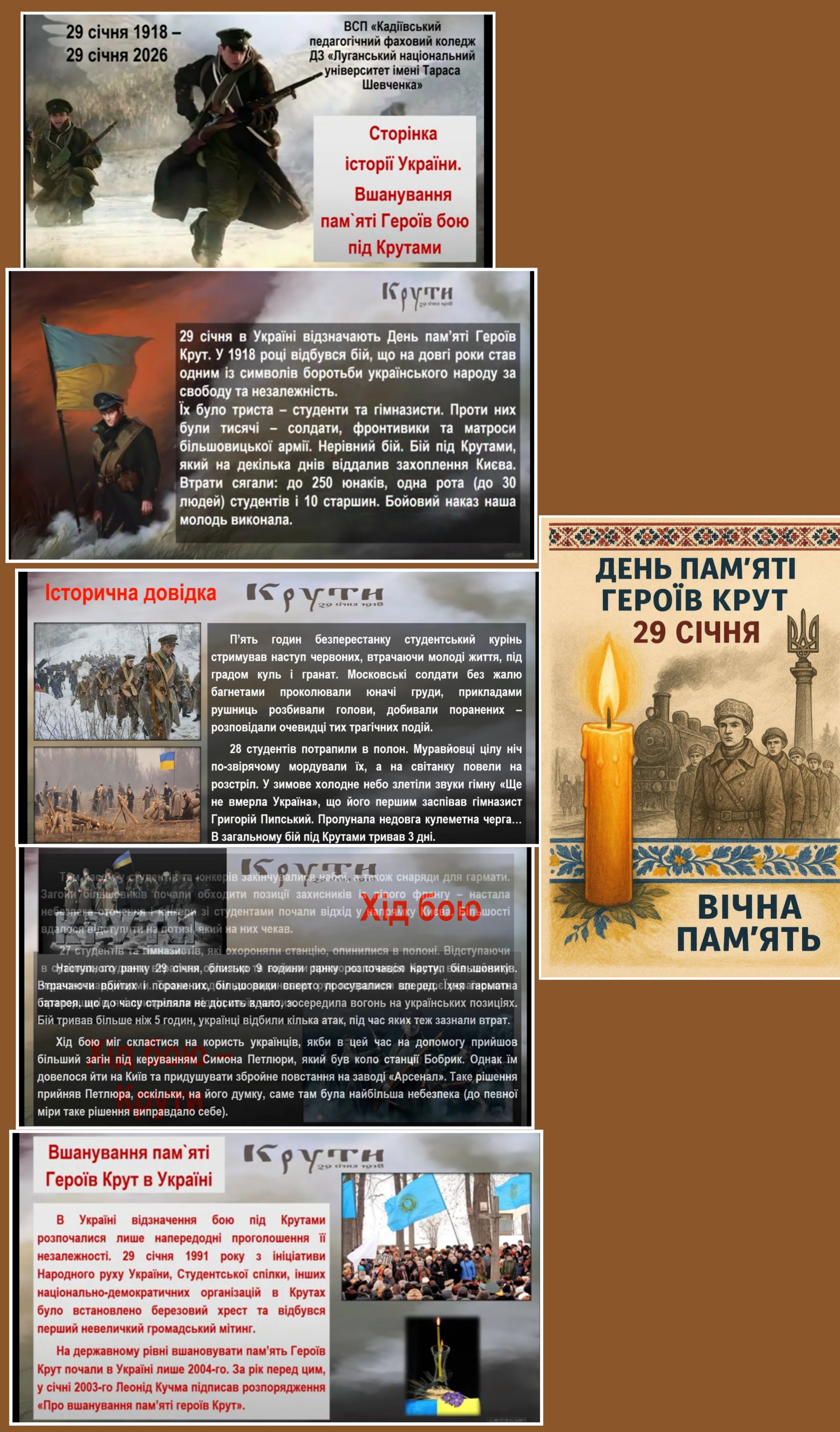 1. перегляд змістовного відеоролика «Сторінка історії України. Вшанування пам’яті Героїв бою під Крутами», створеного студентською радою коледжу, який ознайомив здобувачів освіти з героїчними подіями 1918 року;